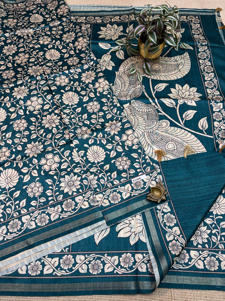 Printed Soft Rawsilk saree with kalamkari prints and Tissue Borders with Blouse