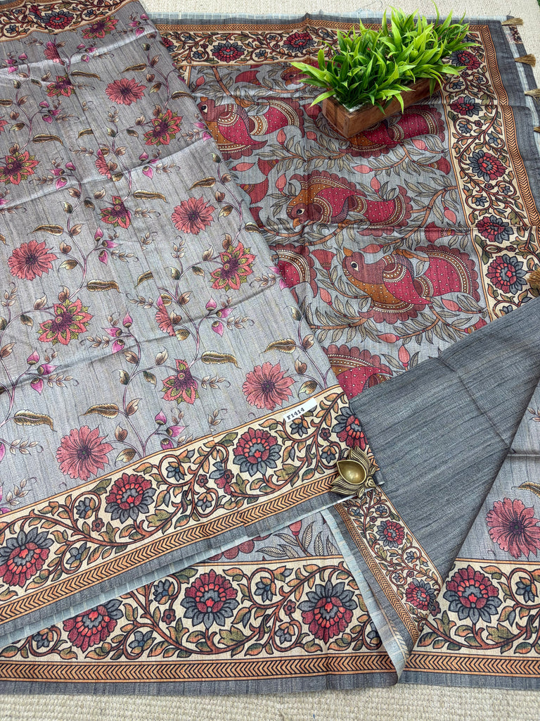 Printed Soft Rawsilk saree with kalamkari prints and Tissue Borders with Blouse